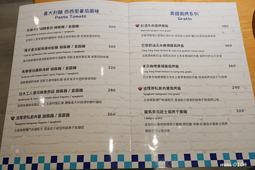 店內使用在地及國外進口的食材,餐點有義大利麵、異國焗烤、風味燉飯、經典排餐、歐式早午餐等等