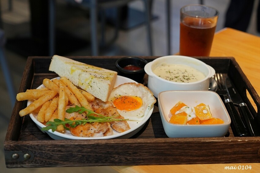 早午餐含香草太陽蛋、季節水果優格、薯條、麵包、濃湯、飲品