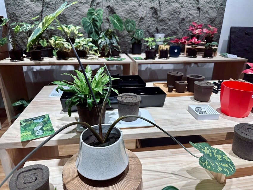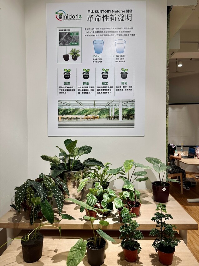青賞除了工程綠化以外在永康街這個地下一樓的店面還有零售跟移植盆裁,其特色是採用日本TOYOTA SUNTORY Midorie一種無土介質來栽種,這種專利PAFCAL保濕可以長達數日,不用早晚澆水,十分方便,好清潔、重量是土壤的一半,吸水散水穩定而且很十分乾淨環保