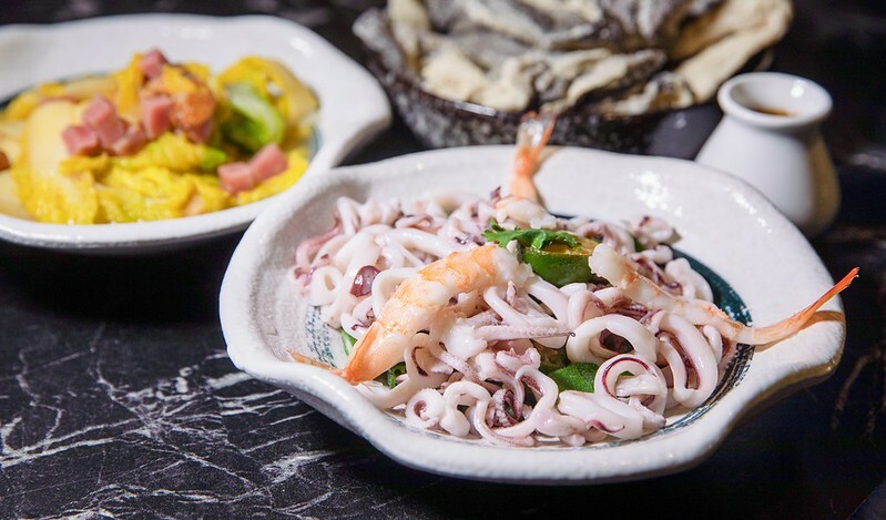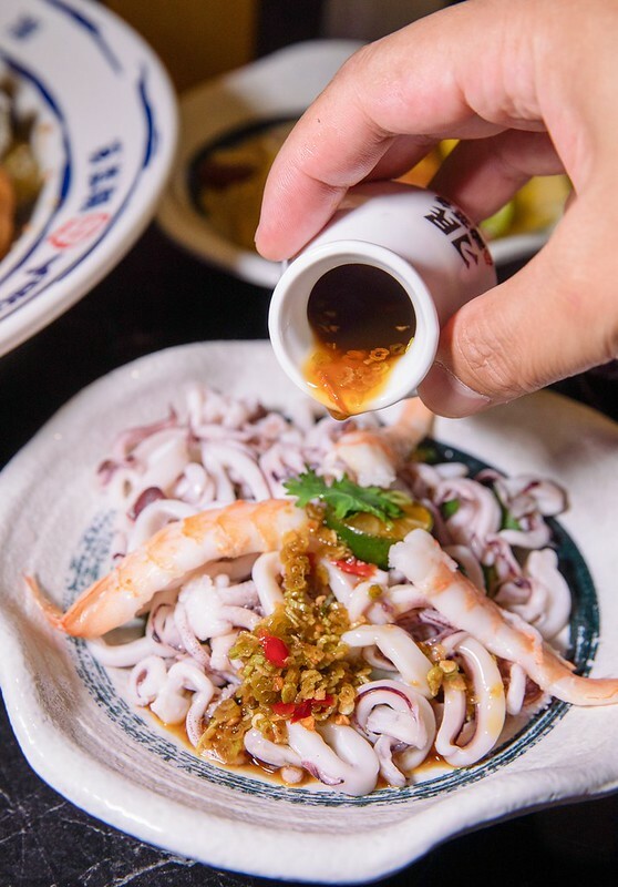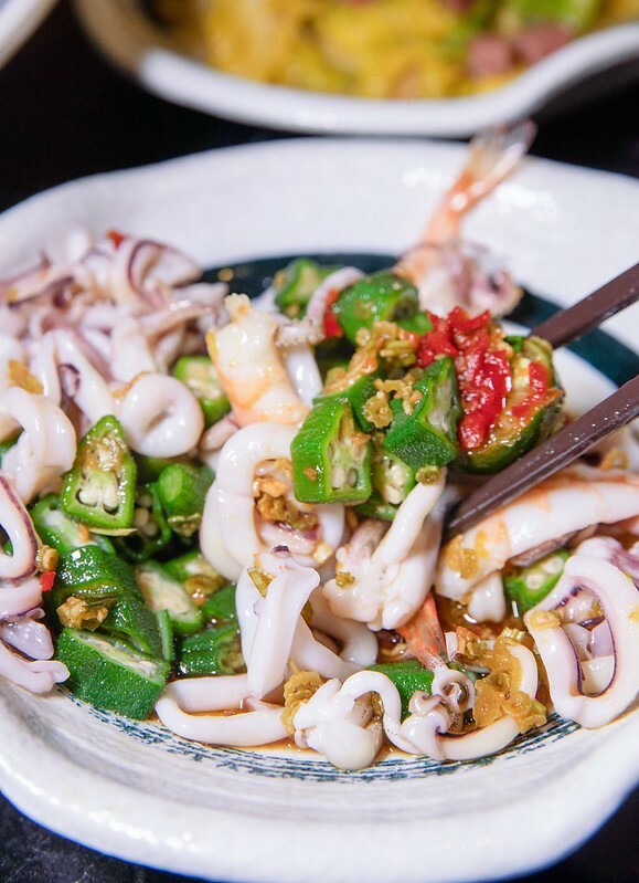 服務人員推薦的醬汁小卷120,份量算是不少,除了小卷外還有兩隻白蝦,小卷、蝦子的鮮度、甜度也對得起這個價格,附上的醬汁很特別,酸菜、辣椒,吃起來有一點呼應酸菜魚,但多了一點涼伴菜的爽口,蠻開胃的。拌開後發現,底下還放著不少的秋葵,和醬汁更搭。
