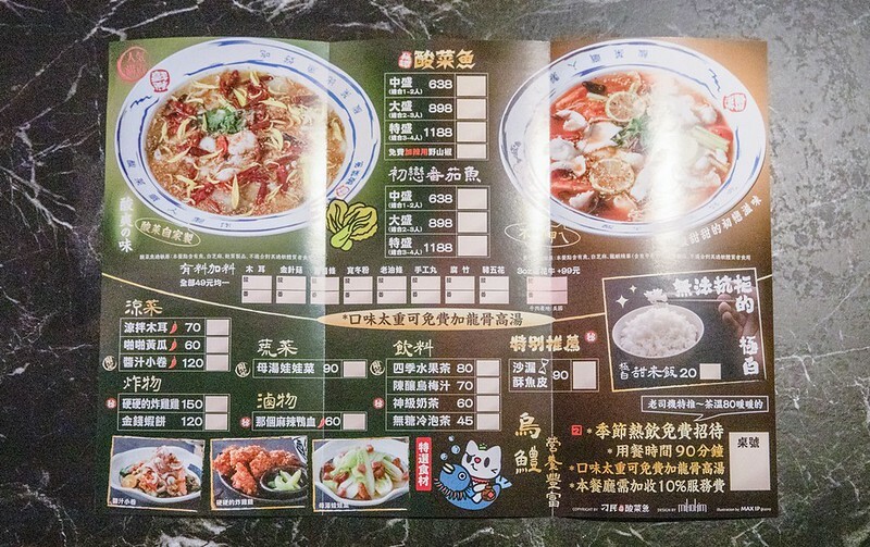 菜單menu不是太復雜,主要當然是酸菜魚,分為中(638元)、大(898元)、特大三種(1188元),另一種「初戀蕃茄魚」應該是給真不敢吃辣的朋友。湯頭怕太辣、太重也有龍骨高湯可以加。配料方面都可以另外單加每樣是49元。還有一些簡單的涼菜和炸物、滷味,價格都在100元上下,整體來說算是親民,難怪會大受年輕人歡迎。