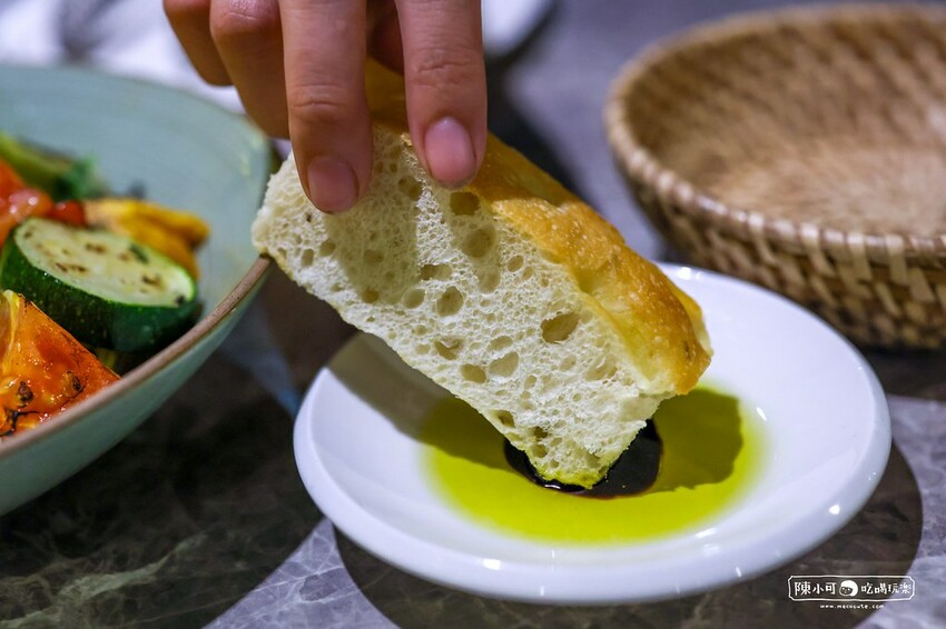 烤得外脆內軟帶有嚼勁的層次,搭配附有巴薩米可醋跟橄欖油調製的沾醬。