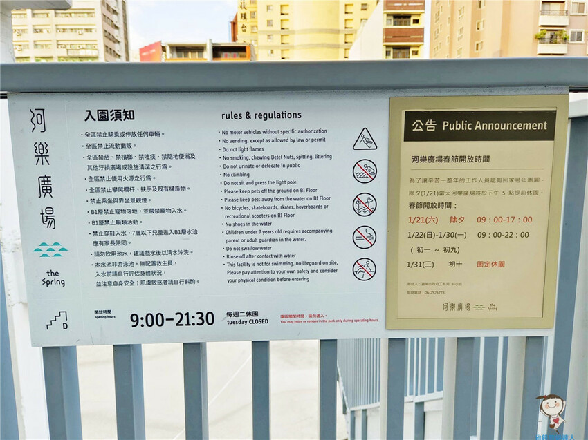 通往下方樓梯的告示牌,上面寫著河樂廣場的開放時間和入園需知