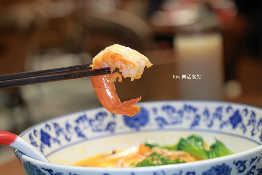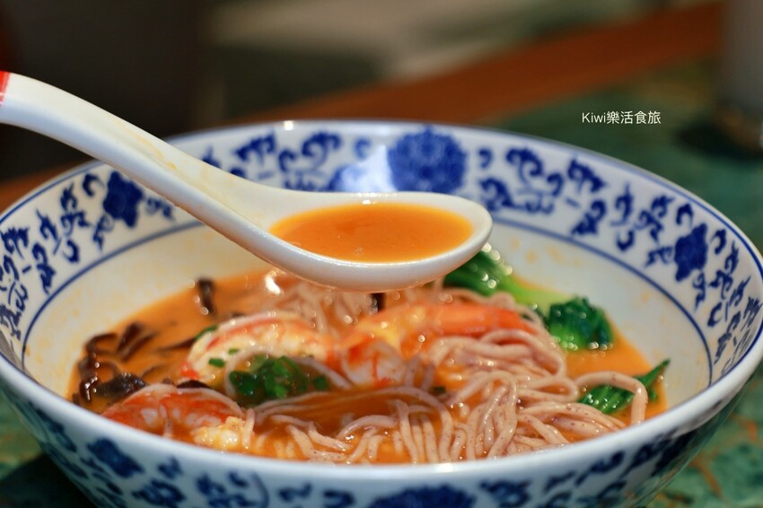 這份青島對蝦藜麥麵的主軸是麵條與湯頭,細緻的湯頭在熱熱喝的時候,感受到是蝦子滿滿的鮮甜味,這是很難得的香氣與味道,看似很濃郁喝起來卻有著清爽的口感。