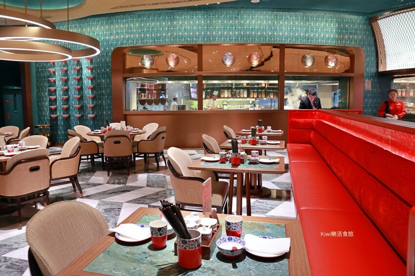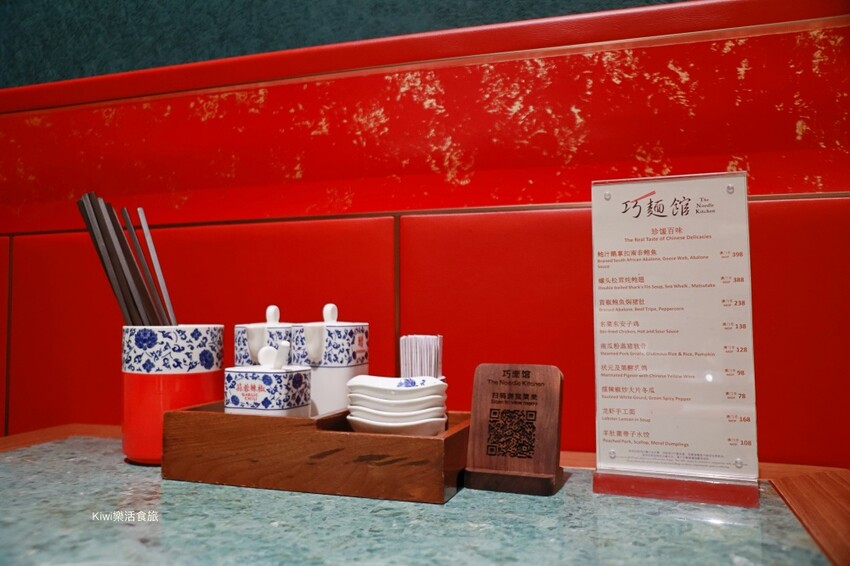 巧麵館裝潢以紅、金、湖水綠的色彩做為搭配,每桌的感覺猶如盛開的花朵,桌上的擺盤藍蝶花骨瓷具,打造那現代感卻又典雅的空間氛圍~