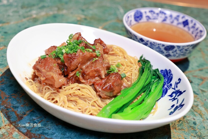 五香牛腩麵以乾麵呈現出來,還會附上一碗湯,上頭的牛肉滿滿~還有附上兩顆菜,太可愛了。