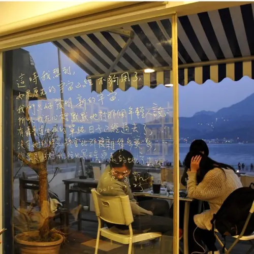 說到玻璃詩, 有河不定期的會請詩人在書店裡唯一的大玻璃落地窗上,