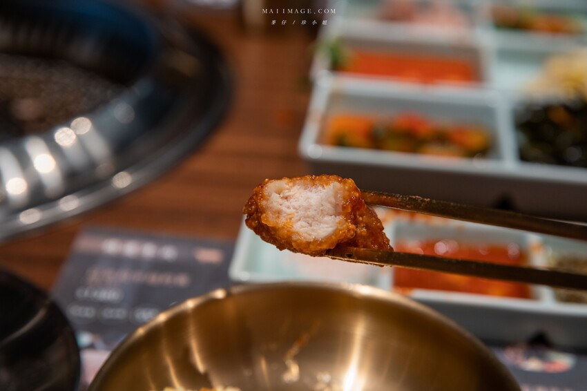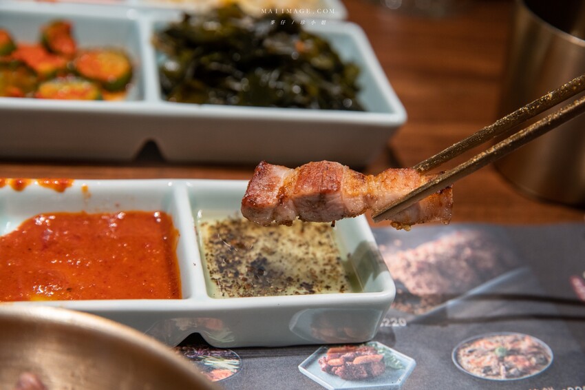 來韓式燒肉絕對不能錯過的豬五花,帶皮的豬五花經過高溫的烤爐逼出油脂,自然的油脂香氣搭配特調的調味料滋味真棒,如果擔心太過油膩可以跟包肉生菜一起品嚐。