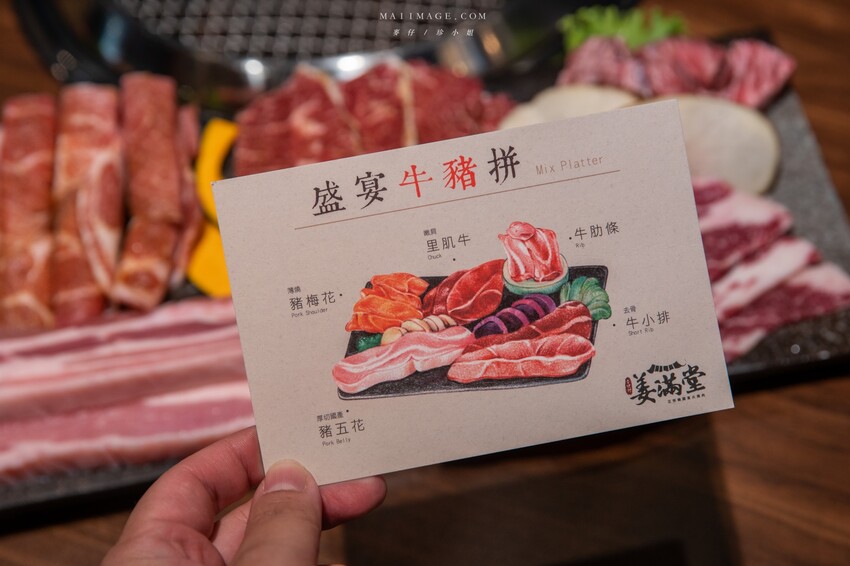 接下來是我們這天的『姜滿堂』的餐點~這盤四人份的肉品裡面有骰子牛、牛橫隔膜、牛小排、牛肋條、豬肋條、松阪豬、還有豬梅花、豬五花,最後再搭配一塊澳洲肋眼牛。如果想要吃日本和牛只要再加價980元就有一大塊的日本A4和牛紐約客,相當划算喔。