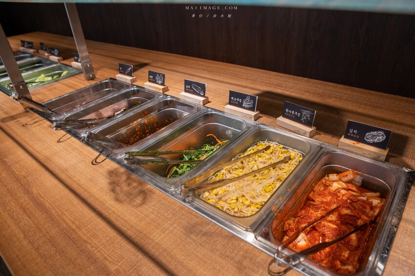 桌上的韓式小菜是無限量供應的,在入座時就會先上一份完整小菜,如果吃不夠就可以自己到自助區取用。小菜的選擇相當多,光是眼前這些就有六種小菜可以選,有我最愛的韓式泡菜、黃瓜、豆芽菜、醃蘿蔔。