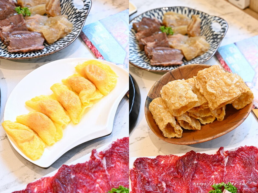 除了季節時蔬,套餐中還有附上蛋餃及炸豆皮,是說糖糖本身不會主動去點蛋餃來吃,森鄰鍋物的蛋餃還不錯,採用手工蛋餃而不是冷凍包裝那種,蛋皮不會爛爛的,裡頭的肉餡也相當紮實多汁