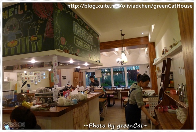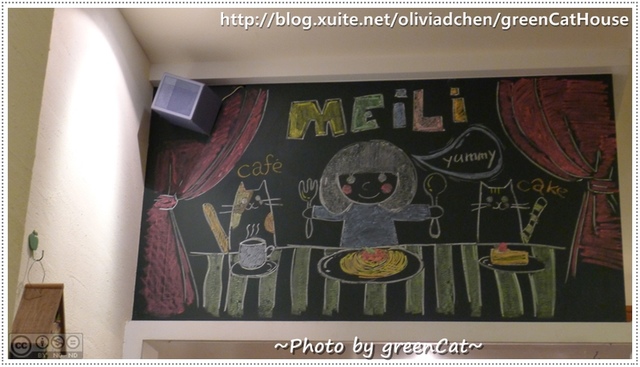 櫃台上方有塊黑板,畫著很可愛的小女孩和兩隻貓,
