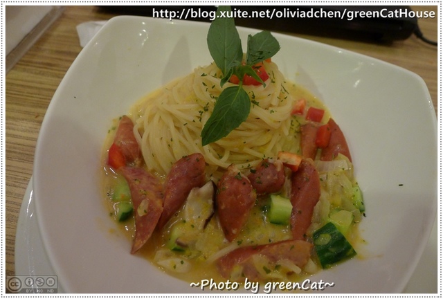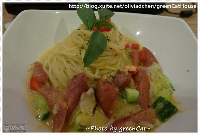 我的是"火烤德式肉腸義大利麵",加南瓜黃醬,搭起來有種特別的感覺噢!~ :D