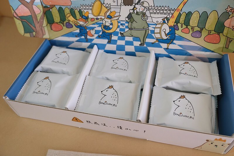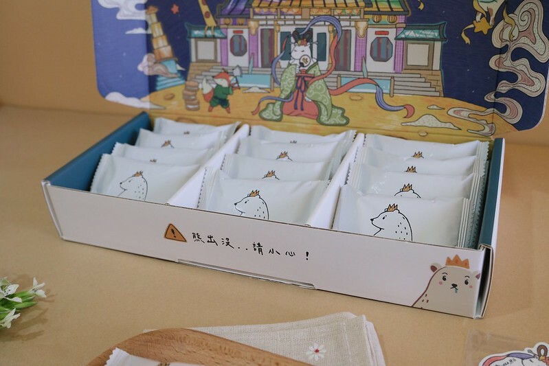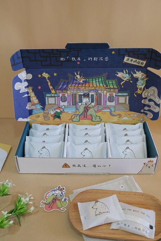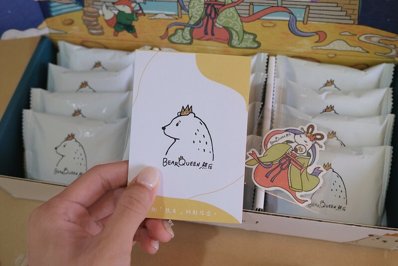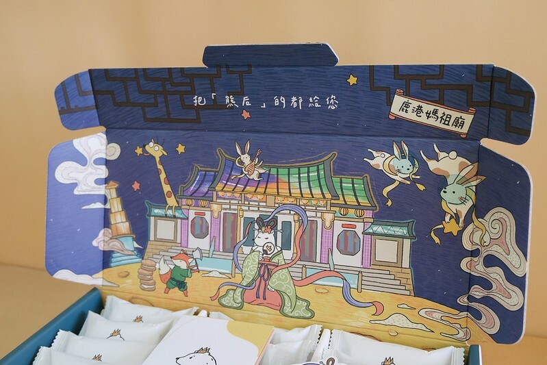 打開超療癒的熊后中秋禮盒,質感真的滿滿的,是熊后與動物們一同在鹿港媽祖廟前慶祝佳節的插畫,裡面共有12片獨立包裝的牛軋餅,以及產品折頁DM及一張熊后插畫貼紙。