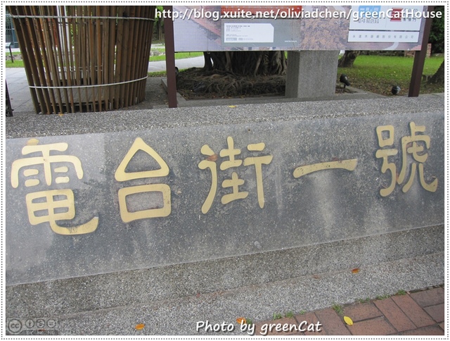 在充滿巴洛克風格的門邊石造圍牆上嵌著大大的"電台街一號 台中放送局"字樣,