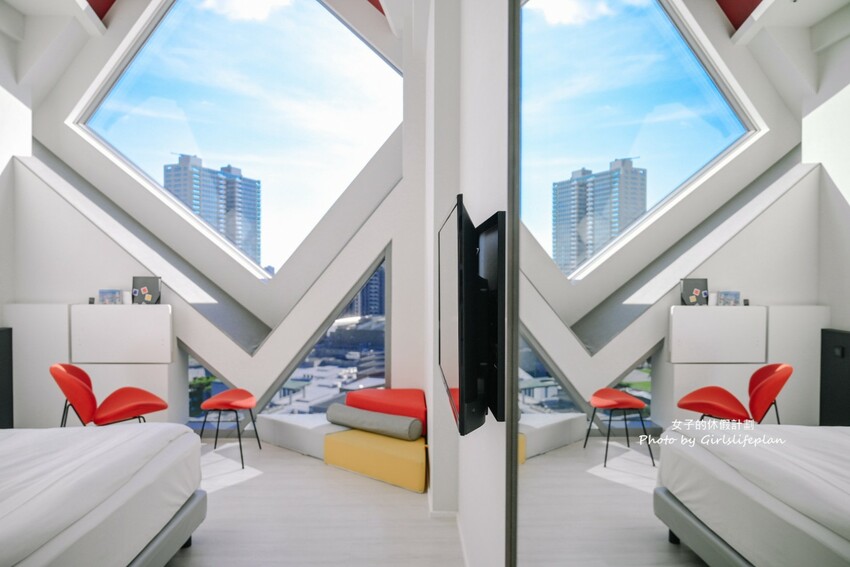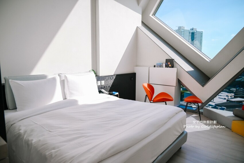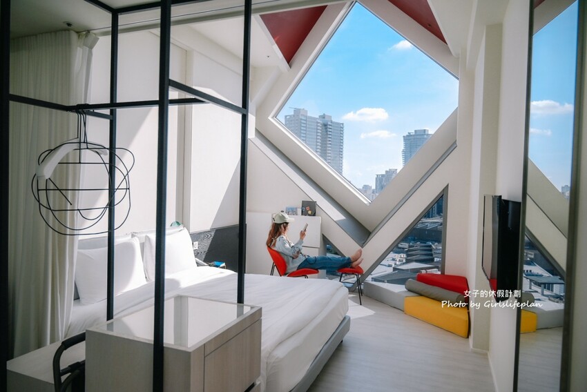 12樓的星空房型,是由幾何造型大片玻璃窗轉換出不同角度之觀景窗,窗外就是一幅絕世美景,從日出至日落,映入眼簾晚霞的粉紫色有夠夢幻,夜晚城市星光點點超微醺,早晨再由暖陽喚醒,一整天真的很Chill。