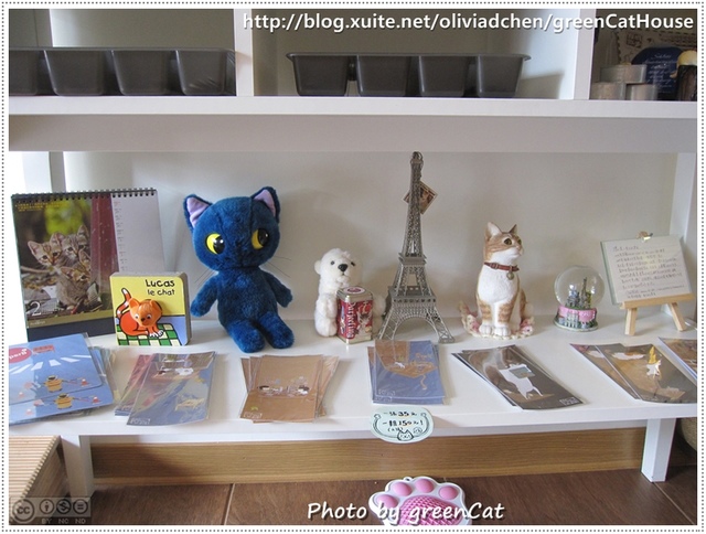 而另一邊的牆邊擺著一張小矮櫃,上頭擺著和貓咪有關的紀念商品,