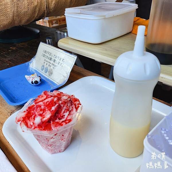 噹噹~~就是這個草莓剉冰!! 日本的草莓剉冰是用冷凍草莓去剉出來的,是真的名副其實的"草莓剉冰",煉乳可以自己加,怕酸的朋友們多加一些喔!!
