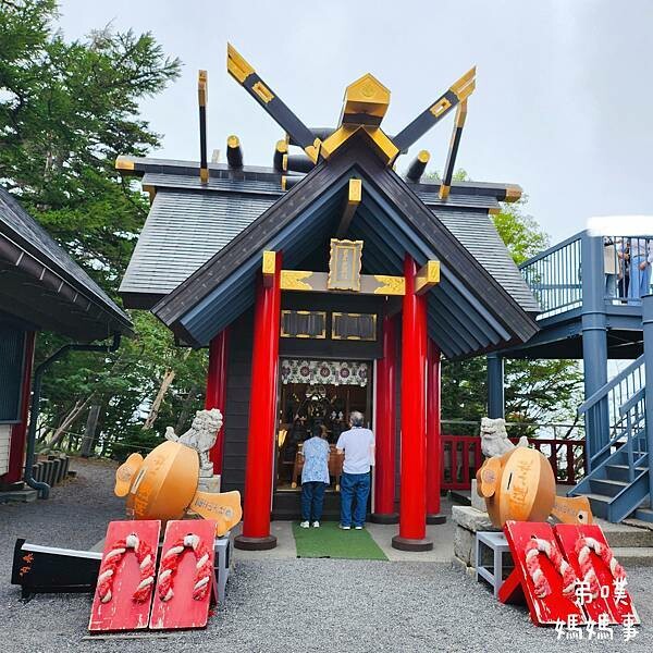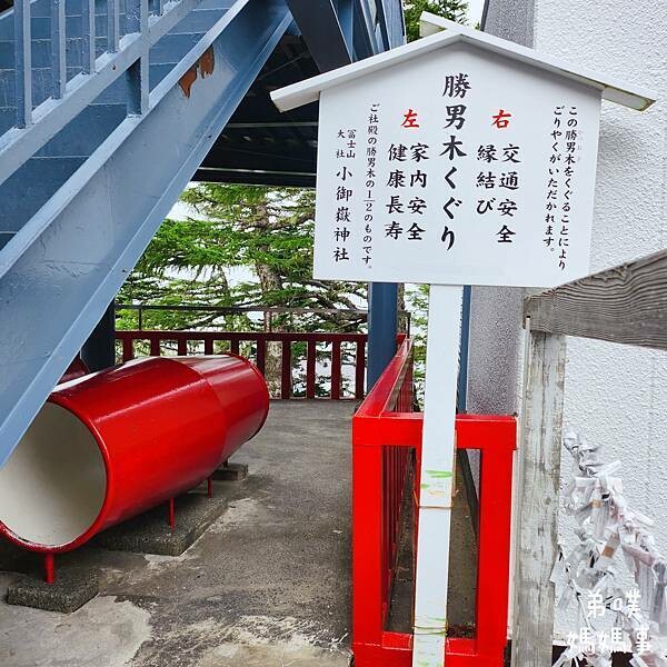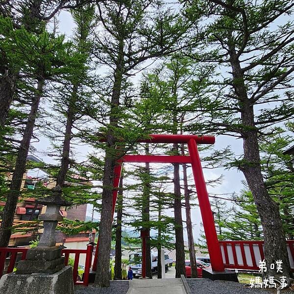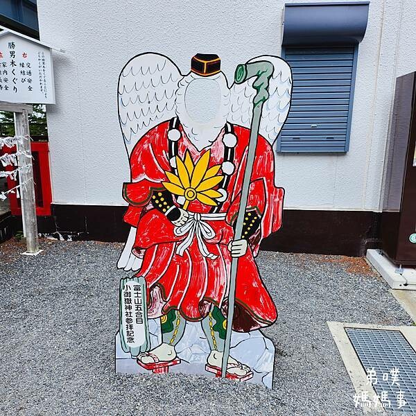 參考網路資料,"富士山小御嶽神社"於937年在山嶽信仰的聖地小御岳山頂(富士山五合目)被創建,是個比富士山歷史還悠久的地方。富士山五合目周邊被稱為“天狗之庭”,因此這裡也祭祀著天狗神,在這神社內會看到天狗神、天狗御朱印、天狗立體繪馬、天狗御守等等,神社內還有一個重達375公斤的大斧!! 每年7月1日舉行開山祭。走進鳥居是看不太到天狗神