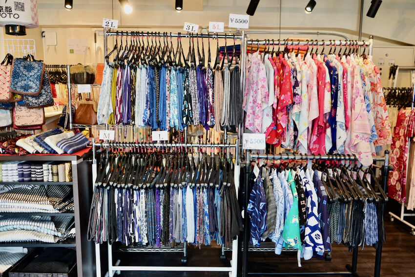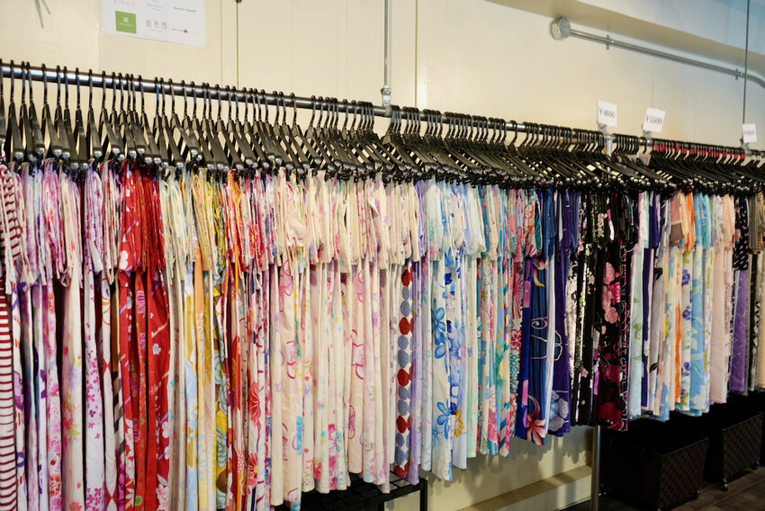 超過200件和服花色,各種風格、顏色、圖案都有,可以拿起來照鏡子,如果不知道怎麼搭配,也可以選擇成套和服方案,只要3300日圓,而且還幫你配好好的喔!