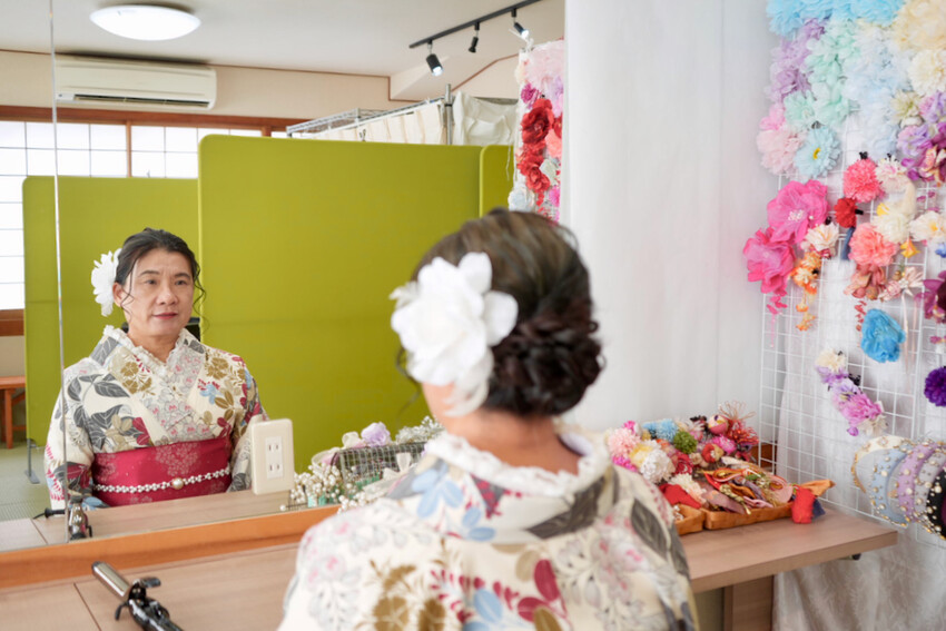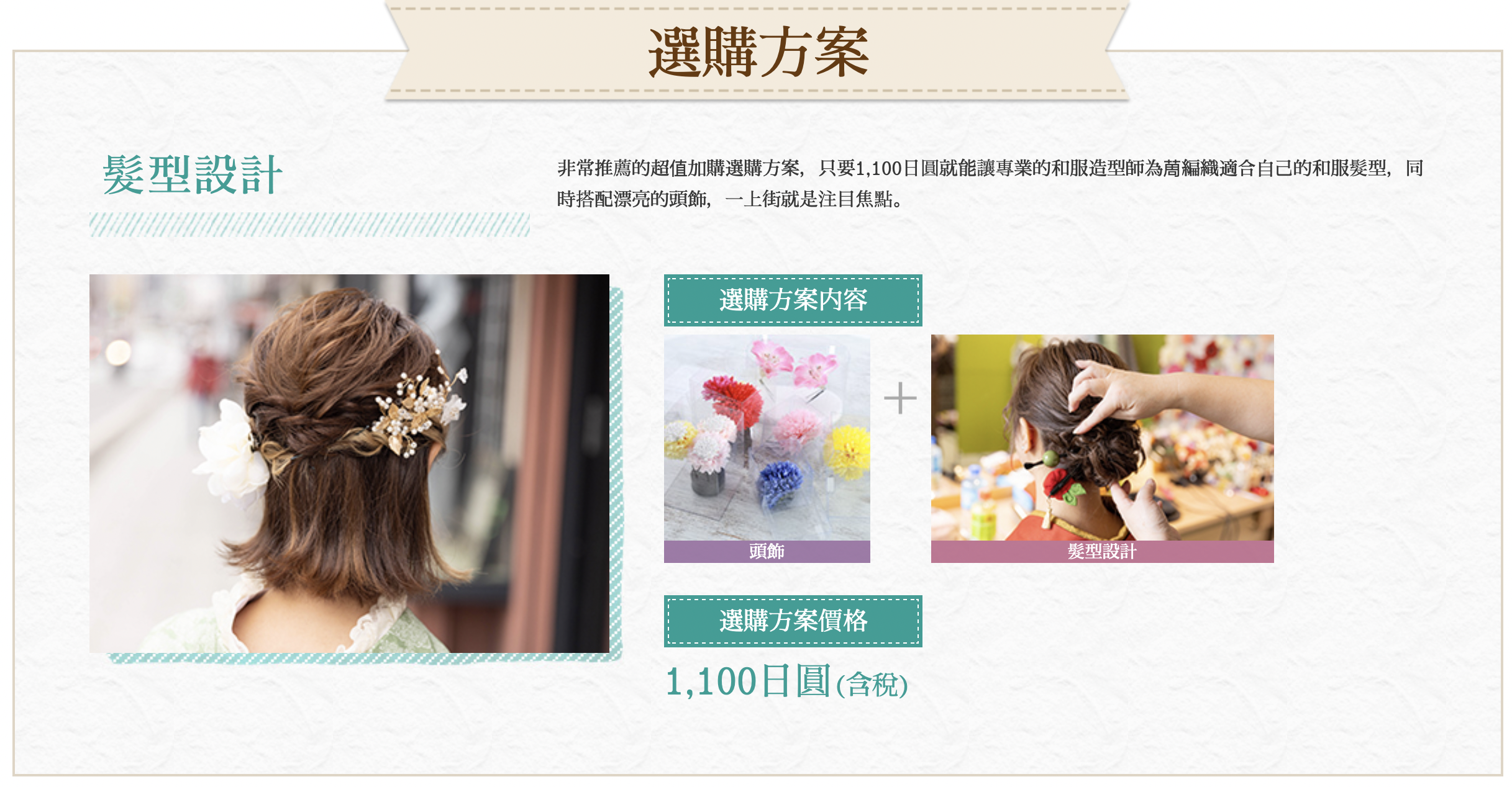 推薦女孩們都可以加購「髮型設計」,只需要加價1100日圓,就會有專業和服造型師為你編髮,還可以選擇漂亮的髮式配件,一整套真的超級美喔!