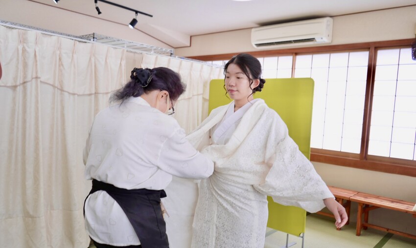 和服造型師非常專業,繁瑣的和服在她的巧手下,一層一層堆疊上去,很快就穿好囉~過程中老師都很細心也很有耐心,也可以用簡單的英文做溝通。