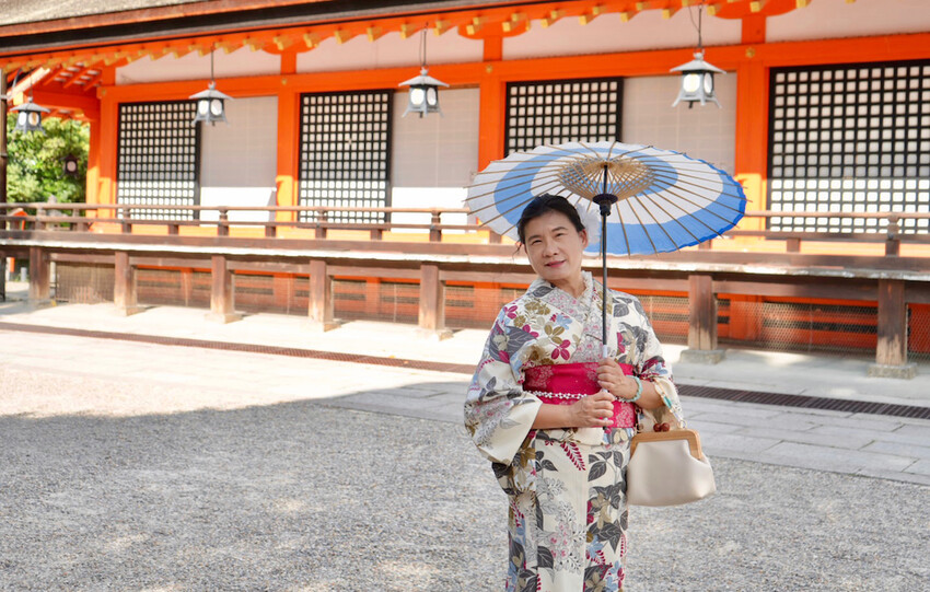 ▻ 與八坂神社 舞殿 合影,夏天很熱可以借遮陽傘或買扇子,都是不錯的配件喔!