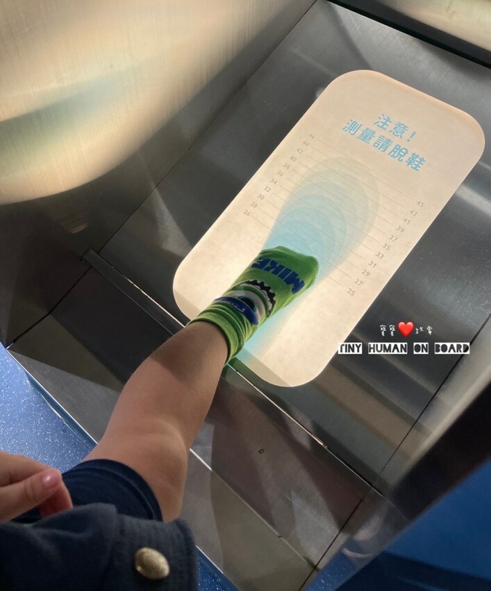 🔽 嗶!嗶!入場後就到租借櫃檯量腳長,剛滿3歲的寶寶腳居然這麼大。 極光冰場沒有年齡限制,但小寶寶的腳長一定要17公分以上才能租冰鞋。