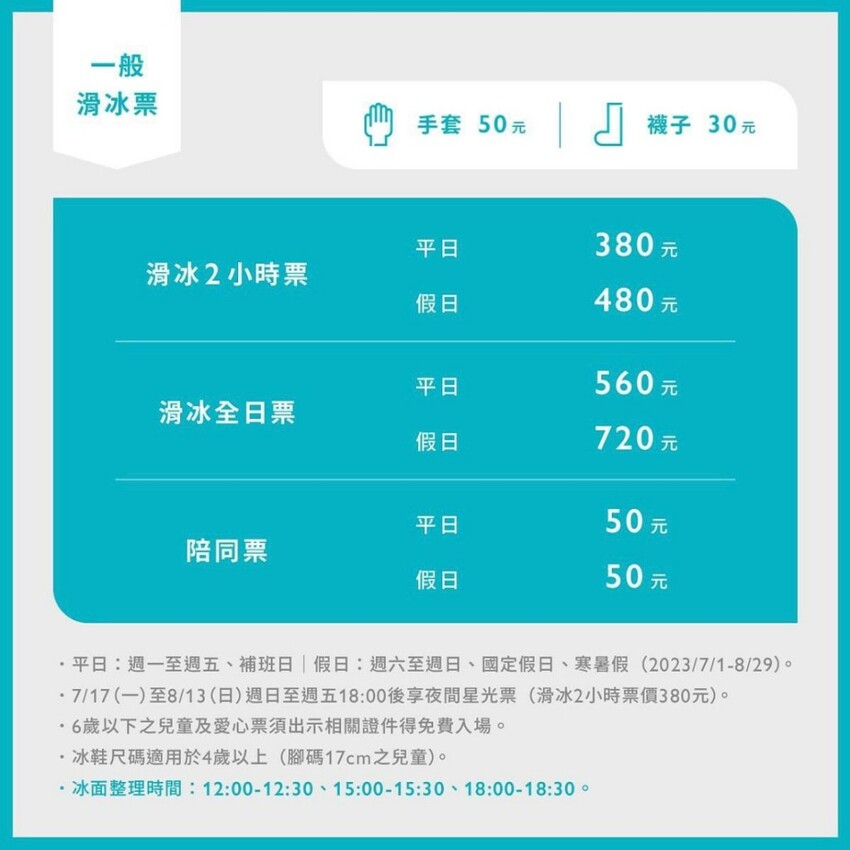 - 冰面整理時間為30分鐘:中午12點、下午3點、晚間6點,遇到洗冰沒關係,離場時間會自動順延。
