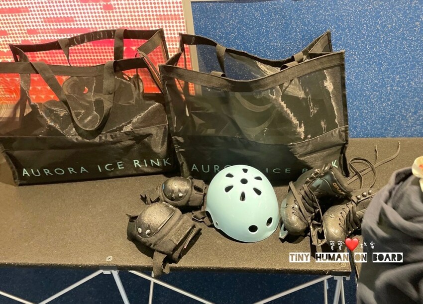 🔽 快來看看裡面有什麼法寶:有滑冰鞋、安全帽一頂、護具各一套(護膝和手肘)。 但是要上場,記得也要戴上手套喔,不然場上教練是會一直來提醒你的喔!(忘記帶自己手套,現場也有販售)