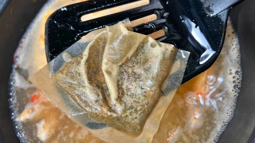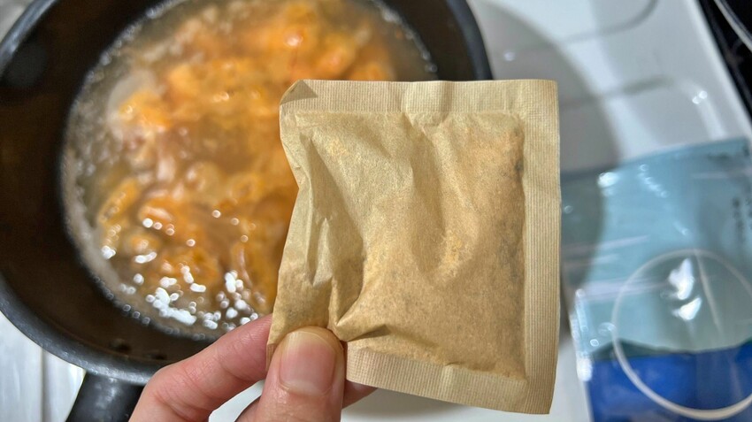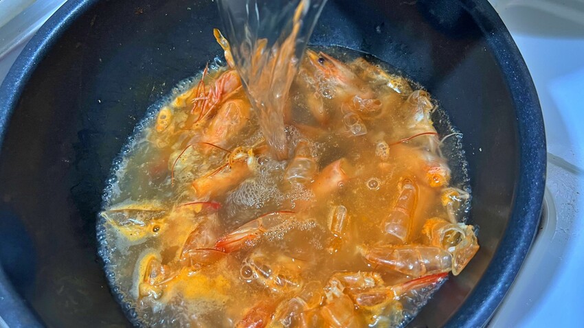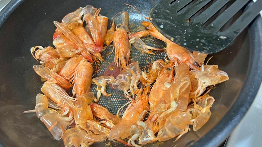 剛才做海鮮炒麵的蝦殼不要丟~~~可以熱油鍋炒蝦頭、蝦殼,再加水、北海道海洋高湯包熬煮