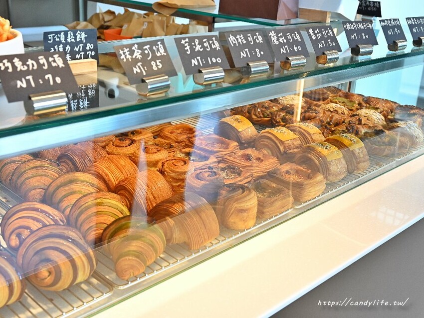 糖糖這天是下午兩點多來品項非常齊全,前方玻璃櫃中陳列了各式各樣的可頌麵包,鹹甜口味通通有,要不是怕吃不完,糖糖還真想全部點一輪(笑)