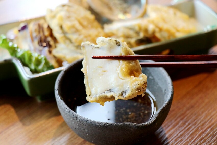 兩顆飽滿又肥美的鮑魚裹上薄脆麵衣酥炸之後再切片