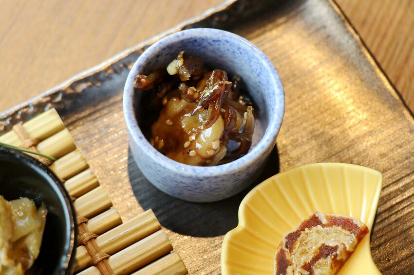 前菜五品包含伊達卷.醃漬榨菜.蜜漬小魚核果.黑豆.柿餅