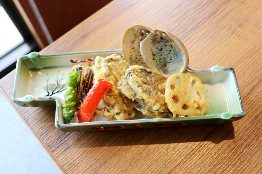炸物包含了紅椒.蓮藕.茄子.糯米椒以及南非鮑魚