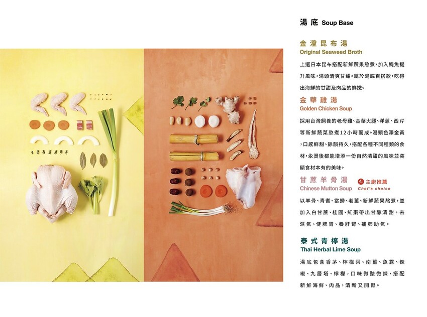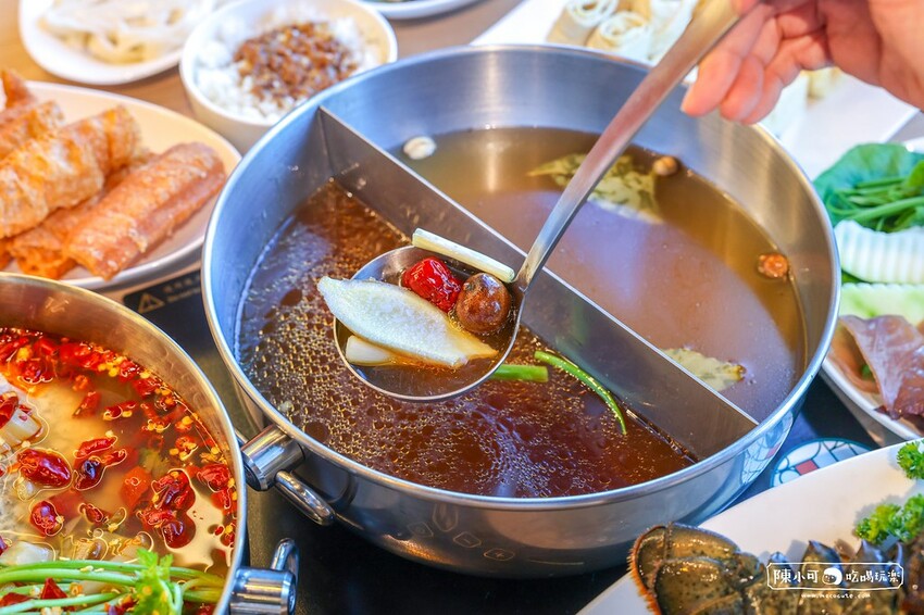 湯底選擇豐富有創意,像是麻辣鍋、昆布湯、金華雞湯、鳳梨蛤蠣雞、溫補黑藥膳、甘蔗羊骨湯和泰式青檸湯等,其他還有麻辣酸菜魚和魷魚螺肉蒜鍋很適合兩到三人點選分享。