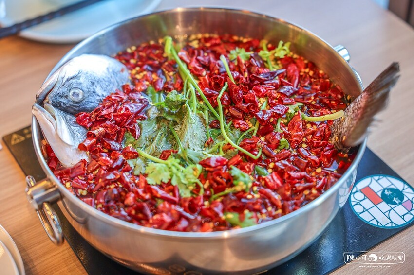 和我一開始想的酸菜魚不太一樣,使用火鍋鍋具裝盛,適合2~3人分享的推薦,一上桌就看到紅通通鮮豔的辣椒,滿滿的超豪邁,加上我很愛的香菜點綴提味。