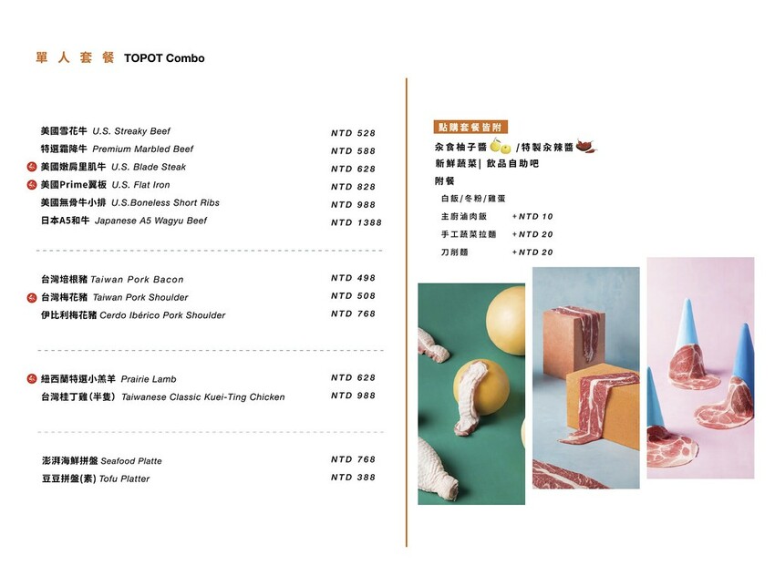 餐點以套餐方式消費,有單人套餐也有雙人套餐和四人海陸饗宴套餐等,一個人來吃火鍋也很適合。