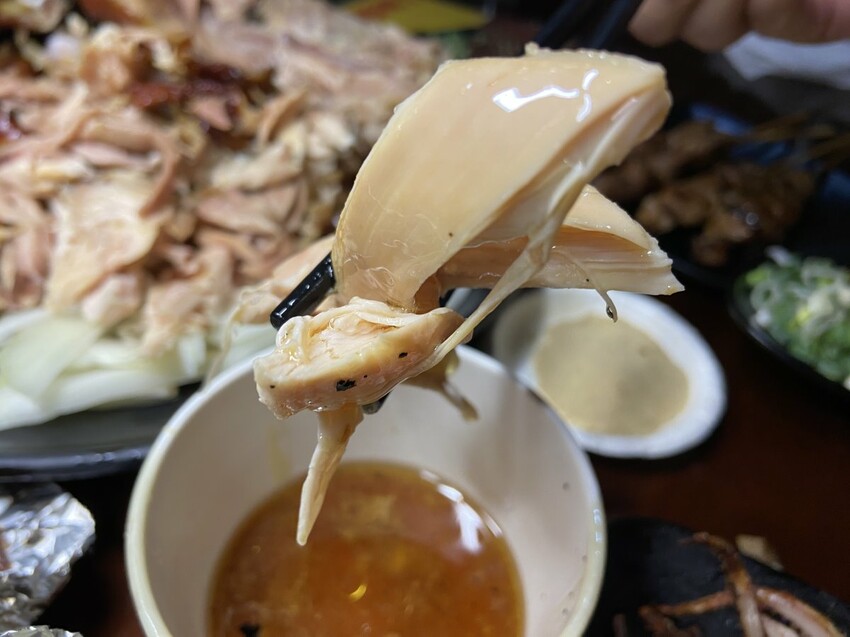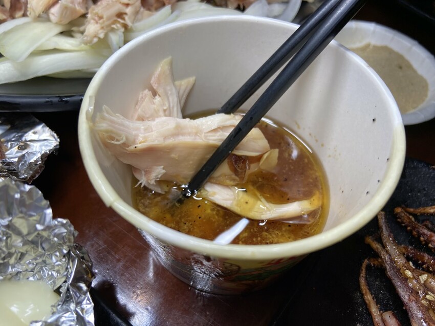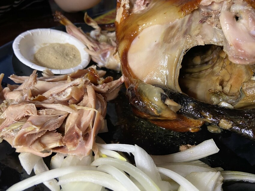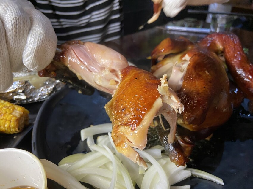 整隻雞很有份量大約有二斤半的重量,雞肉吃起來軟嫩多汁,在分解雞肉時,香氣四溢令人口水直流,尤其雞皮吃起來帶有焦糖鹹香迷人美味,對於不太吃雞皮朋友也吃得很開心,除了搭配洋蔥或椒鹽,特別推薦沾上雞油吃讓雞肉口感提昇更多層次。