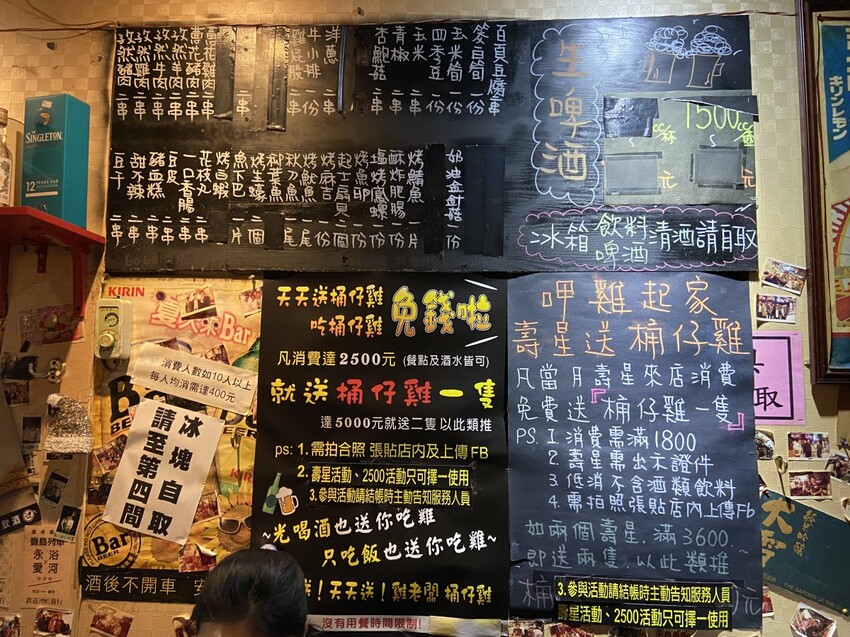 店內的裝潢很有日式居酒屋的氛圍,牆面除了手寫菜單之外,也貼滿一堆已成功兌換免費桶仔雞的壽星照片。