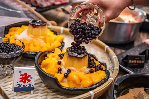 巴適經典麻辣鍋林口店除了季節限定吸睛的金枕頭榴槤吃到飽,本體其實是麻辣火鍋吃到飽,菜單還有頂級菲力牛、熟成翼板牛、安格斯五花牛、帝王牛、紐西蘭牛舌、草蝦和A級松阪豬等超過60種食材選擇吃到飽。