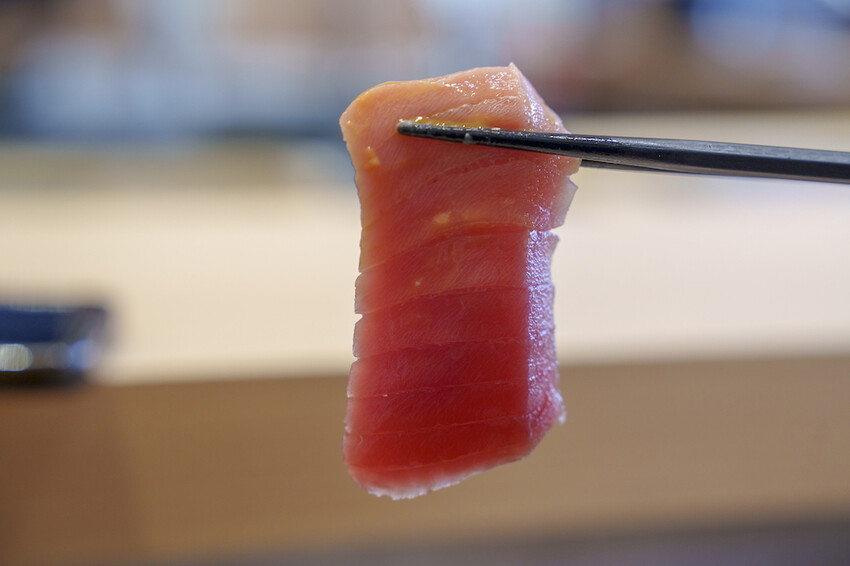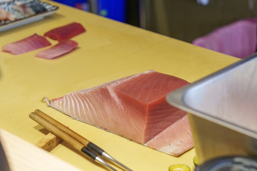 生魚片丼飯現點現做,師傅用俐落的刀法切下新鮮的生魚片。新鮮真的是看的見的,生魚片們的色澤紅潤閃動,讓人口水已經是要留到地上去了。