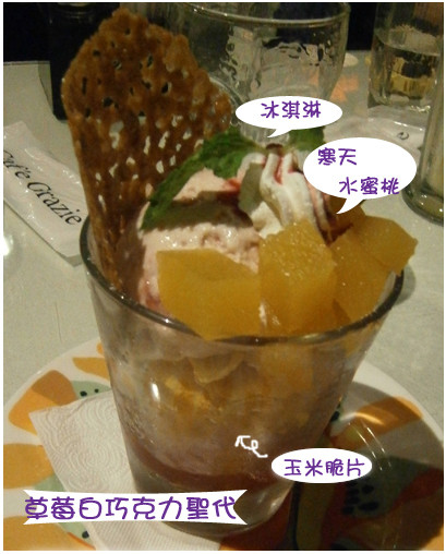 上面的草莓冰淇淋看起來就粉透心涼,還有寒天水蜜桃~有機會我一定要吃一次聖代(還沒吃過的說)這是落伍啊!^_^