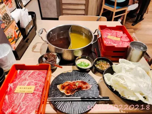 ↓湯頭我是選壽喜燒。人員上餐,鍋中下油,炒過洋蔥、蔥段(?,肉片。
