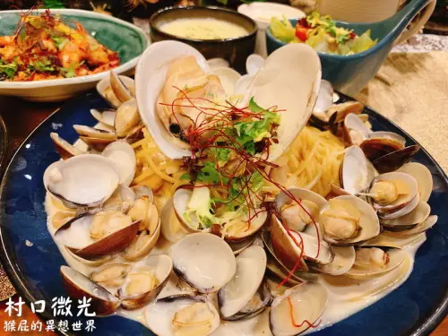 將奶香義大利麵與現炸出爐的香酥嫩雞堆置的像座小山丘般高,香炒野菇與時蔬大氣擺放一旁,佐以閃亮如橙色寶石的香煎鮭魚,這盛盤畫面看著就眼饞不已呢。