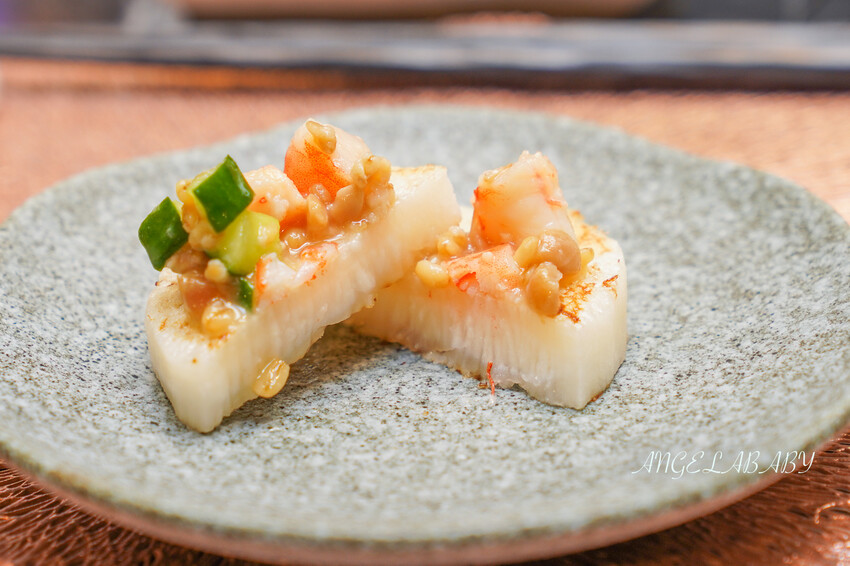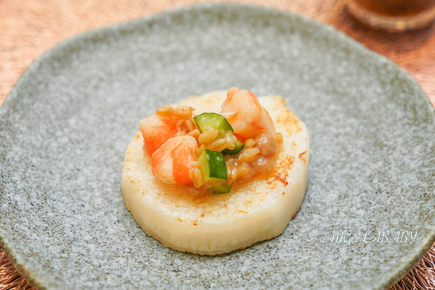 山藥在鐵板上煎過鬆軟中帶點膠質,搭配赤味噌的鹹香、白蝦肥美、黃瓜爽脆