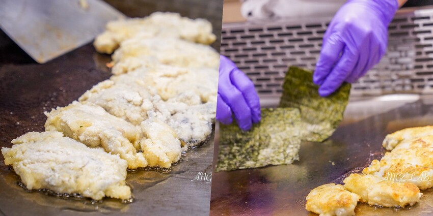 巨無霸的日本廣島牡蠣簡單拍粉在鐵板上煎到兩面金黃洽洽,海苔在鐵板上加熱更酥脆