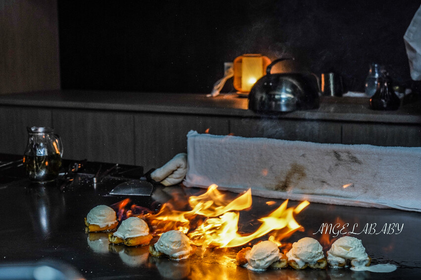 鐵板上香煎香蕉放上一球冰淇淋,淋上白蘭地酒以火焰炙燒~瞬間讓全場尖叫了,慶生好適合來這裡