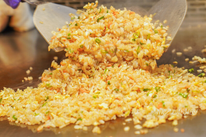 很多人說吃鐵板燒炒飯才是判斷手藝,鐵板上飛舞的白飯每一顆都裹上蛋液變成金黃色