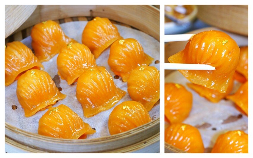 ▼胭脂金箔蝦餃橘紅色外皮是用胡蘿蔔汁以及澄麵來製作,每顆蝦餃裡面包著完整一隻蝦子,圓潤飽滿,皮也很有彈性。